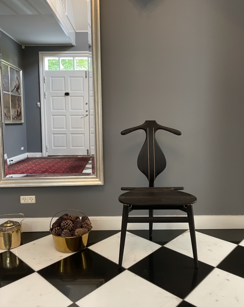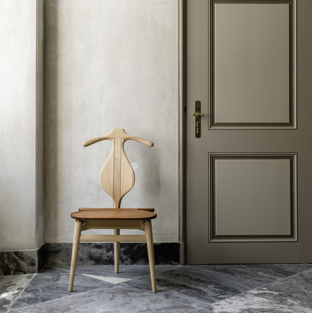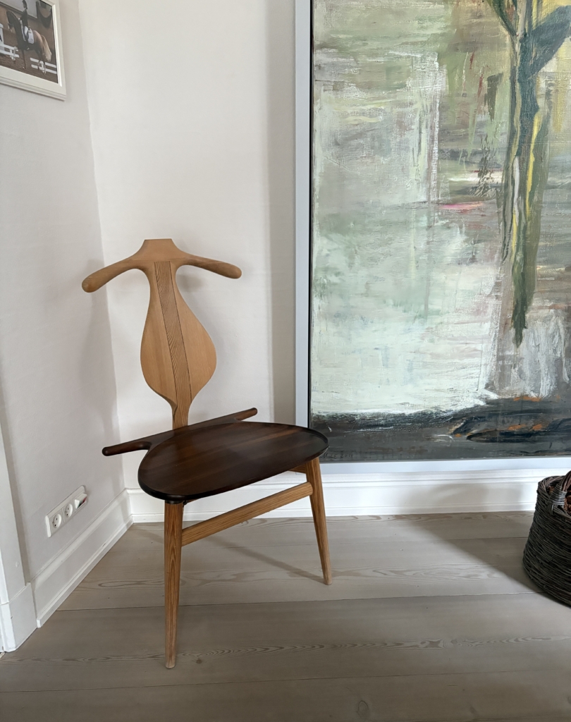 北欧デザインの巨匠 ハンス・J・ウェグナーにより、建築学教授のスティーン・アイラー・ラスムセン、デザイナーのボー・ボイエセンとの、就寝時の衣服をいかに効率的に整頓するかという長期にわたる話し合いの末に、1953年にデザインされたのがこの「pp250 Valet Chair(ヴァレットチェア)」です。デンマークのPPモブラー社にて製造されています。