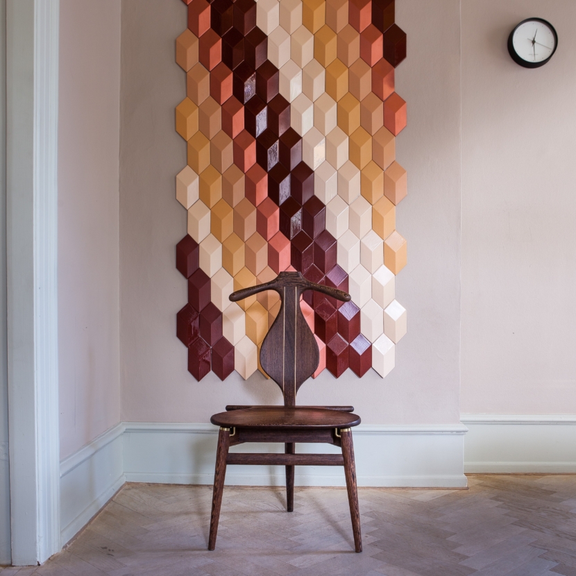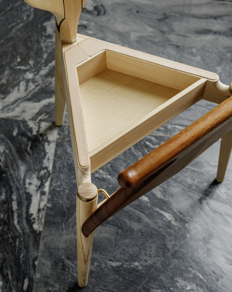 背がハンガー、座面を手前に倒してズボン掛け、座面の下の三角ボックスはポケットの中の小物を入れるスペースとなります。この1脚があれば身の回りが片付くことから「ヴァレット(従者、召使い)チェア」と呼ばれる、ユニークな椅子です。