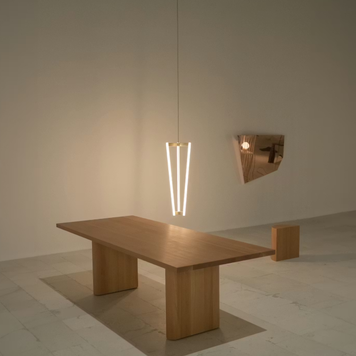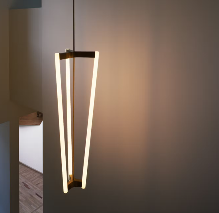 縦に伸びるデザインは、リビングやダイニングはもちろん、エントランスやロビーなどの吹き抜け空間では立体的な印象がより引き立ち、光るチューブのみが浮遊して見えるよう設計されています。