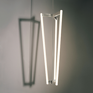 チューブシャンデリアは、マイケル・アナスタシアデス・コレクションの最初の照明として2006年にデザインされ、3本のチューブ型光源からなる縦型のシャンデリアです。最小限の数の白熱灯を彫刻的な配置で吊り下げ、垂直のシャンデリアを形成するという課題を引き算の手法で見事に体現しています。