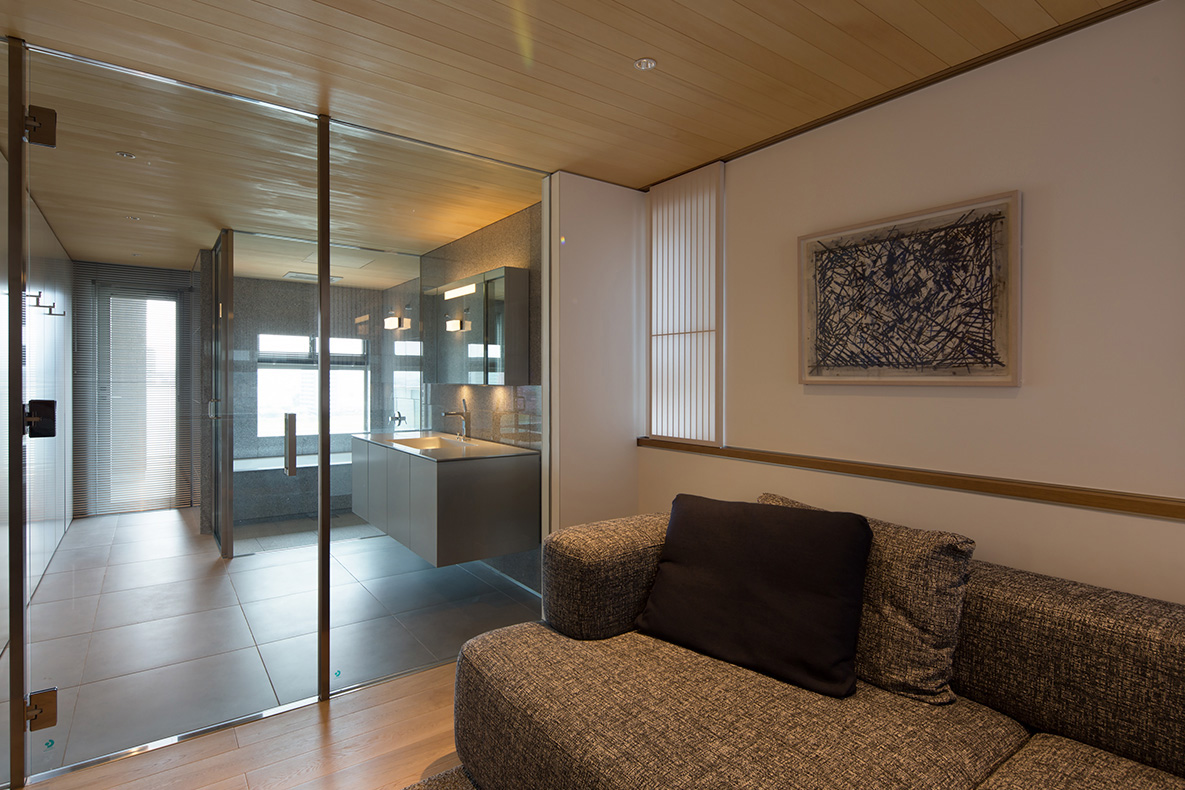 床は九州でとれる清武石を目地を入れずに敷いており、素足で触れた感触が石とは思えないほど優しく、全く疲れないとお客様は仰っておりました。